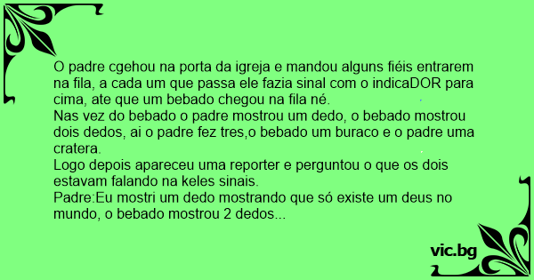 Nas vez do bebado o padre mostrou um dedo, o bebado mostrou dois dedos, ai o padre fez tres,o bebado um buraco e o padre uma cratera.