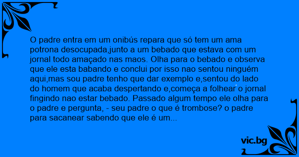 O padre entra em um onibús repara que só tem um ama potrona desocupada,junto a um bebado que estava com um jornal todo amaçado nas maos. Olha para o bebado e observa que ele esta babando e conclui por isso nao sentou ninguém aqui,mas sou padre tenho que dar exemplo e,sentou do lado do homem que acaba despertando e,começa a folhear o jornal fingindo nao estar bebado. Passado algum tempo ele olha para o padre e pergunta, - seu padre o que é trombose? o padre para sacanear sabendo que ele é um pecador resp:meu filho trombose é uma doença que da em pessouas que tem uma vida desrregrada que usa drogas,fuma,bébe enfim pessoas que faz um monte de coisas erradas. O bebado esbugalha 0s olhos se afasta mais para a janela e,fiса totalmente em silencio expremido na janela,nao deu mais um palavra com o padre muito tempo depois, o padre arrependido pensa peguei pesado com o coitado,esta tao envergonhado que nem olhou mais para meu lado vou puxar acunto com ele.