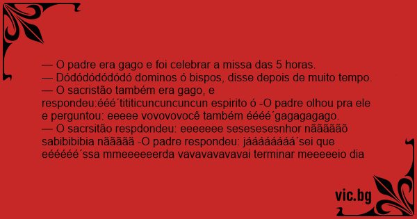 — O sacristão também era gago, e respondeu:ééé´tititicuncuncuncun espirito ó -O padre olhou pra ele e perguntou: eeeee vovovovocê também éééé´gagagagago.