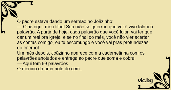 Um mês depois, Joãzinho aparece com a cadernetinha com os palavrões anotados e entrega ao padre que soma e cobra: