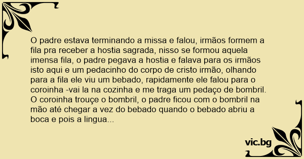 O padre estava terminando a missa e falou, irmãos formem a fila pra receber a hоsтiа sagrada, nisso se formou aquela imensa fila, o padre pegava a hоsтiа e falava para os irmãos isto aqui e um pedacinho do corpo de cristo irmão, olhando para a fila ele viu um bebado, rapidamente ele falou para o coroinha -vai la na cozinha e me traga um pedaço de bombril.