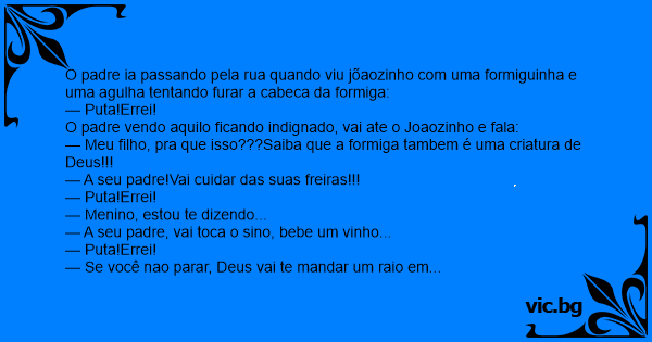 O padre ia passando pela rua quando viu jõaozinho com uma formiguinha e uma agulha tentando furar a cabeca da formiga:
