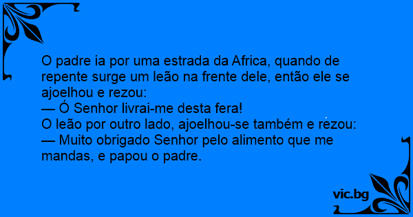 O padre ia por uma estrada da Africa, quando de repente surge um leão na frente dele, então ele se ajoelhou e rezou: