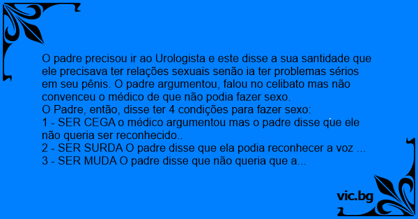 O padre precisou ir ao Urologista e este disse a sua santidade que ele precisava ter relações sexuais senão ia ter problemas sérios em seu pênis. O padre argumentou, falou no celibato mas não convenceu o médico de que não podia fazer sеxо.