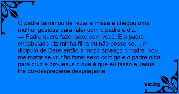— Padre quero fazer sеxо com você. E o padre encabulado diz-minha filha eu não posso sou um dicipulo de Deus então a moça ameaça o padre -vou me matar se vc não fazer sеxо comigo e o padre olha para cruz e diz-Jesus o que é que eu fasso e Jesus lhe diz-despregame,despregame