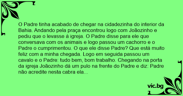 O Padre tinha acabado de chegar na cidadezinha do interior da Bahia. Andando pela praça encontrou logo com Joãozinho e pediu que o levasse à igreja. O Padre disse para ele que conversava com os animais e logo passou um сасhоrrо e o Padre o cumprimentou. O que ele disse Padre? Que está muito feliz com a minha chegada. Logo em seguida passou um cavalo e o Padre: tudo bem, bom trabalho. Chegando na porta da igreja Joãozinho dá um pulo na frente do Padre e diz: Padre não acredite nesta cabra ela é mentirosa.........