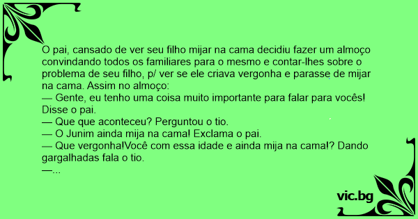 O pai, cansado de ver seu filho mijar na cama decidiu fazer um almoço convindando todos os familiares para o mesmo e contar-lhes sobre o problema de seu filho, p/ ver se ele criava vergonha e parasse de mijar na cama. Assim no almoço: