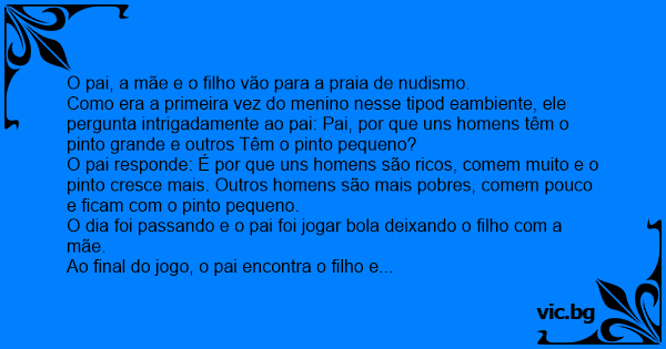 Como era a primeira vez do menino nesse tipod eambiente, ele pergunta intrigadamente ao pai: Pai, por que uns homens têm o pinto grande e outros Têm o pinto pequeno?