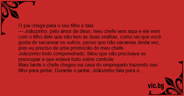 — Joãozinho, pelo amor de deus, meu chefe vem aqui e ele vem com o filho dele que não tem as duas orelhas, como sei que você gosta de sacanear os outros, pesso que não sacaneie desta vez, pois eu preciso de uma promocão do meu chefe.