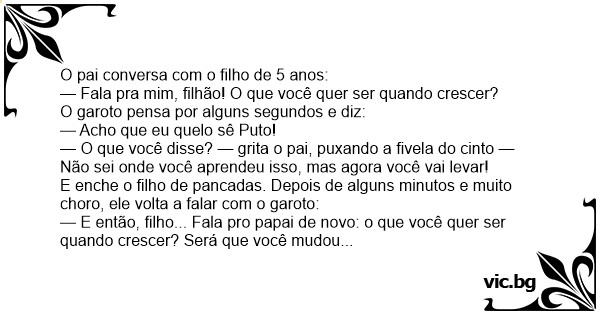— O que você disse? — grita o pai, puxando a fivela do cinto — Não sei onde você aprendeu isso, mas agora você vai levar!