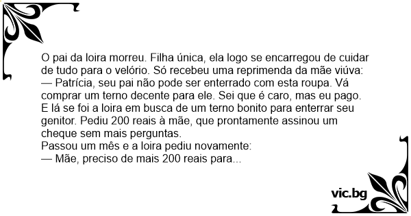E lá se foi a loira em busca de um terno bonito para enterrar seu genitor. Pediu 200 reais à mãe, que prontamente assinou um cheque sem mais perguntas.