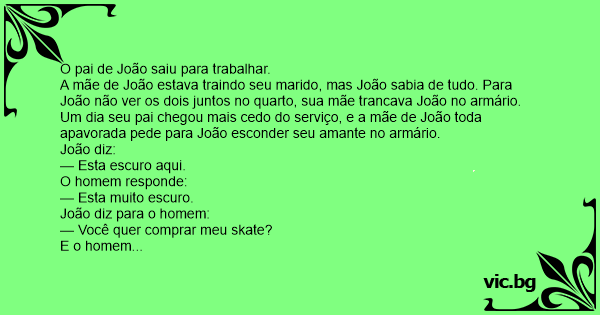 Um dia seu pai chegou mais cedo do serviço, e a mãe de João toda apavorada pede para João esconder seu amante no armário.