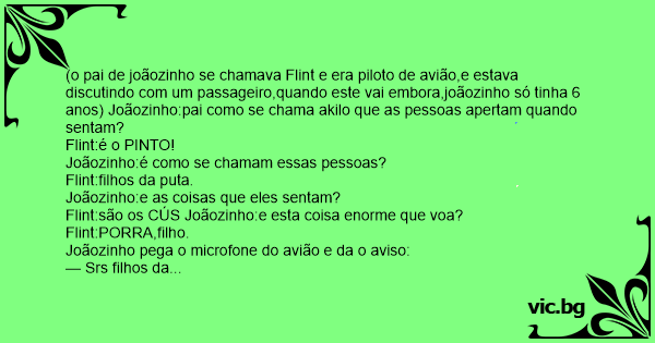 (o pai de joãozinho se chamava Flint e era piloto de avião,e estava discutindo com um passageiro,quando este vai embora,joãozinho só tinha 6 anos) Joãozinho:pai como se chama akilo que as pessoas apertam quando sentam?
