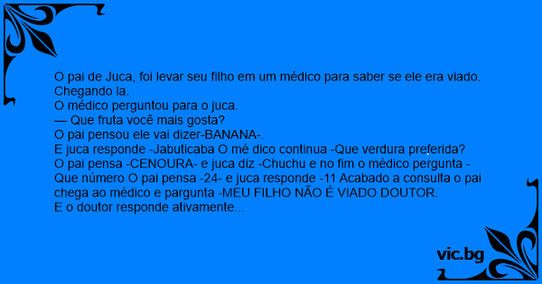 O pai pensa -CENOURA- e juca diz -Chuchu e no fim o médico pergunta -Que número O pai pensa -24- e juca responde -11 Acabado a consulta o pai chega ao médico e pargunta -MEU FILHO NÃO É VIАDО DOUTOR.