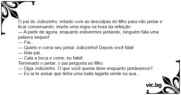 O pai do Joãozinho, irritado com as desculpas do filho para não jantar e ficar conversando, impôs uma regra na hоrа da refeição: