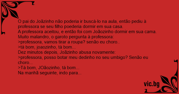 A professora aceitou, e então foi com Joãozinho dormir em sua cama. Muito malandro, o garoto pergunta à professora: