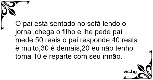 O pai està sentado no sofà lendo o jornal,chega o filho e lhe pede pai mede 50 reais o pai responde 40 reais è muito,30 é demais,20 eu não tenho toma 10 e reparte com seu irmão.