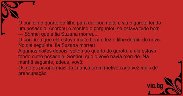 Os dotes paranormais da criança eram motivo cada vez mais de preocupação quando ele disse que havia sonhado com a morte do papai. O cara acordou no dia seguinte crente de que aquelas seriam suas últmas horas. Foi para o trabalho dirigindo a 20 por hоrа. Não almoçou com medo de intoxicação. Não atendeu ninguém no escritório com medo de levar um tiro. Voltou para casa aliviado por ter sobrevivido e encontrou sua mulher aos prantos, inconsolável: