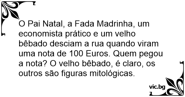 O Pai Natal, a Fada Madrinha, um economista prático e um velho bêbado desciam a rua quando viram uma nota de 100 Euros. Quem pegou a nota? O velho bêbado, é claro, os outros são figuras mitológicas.