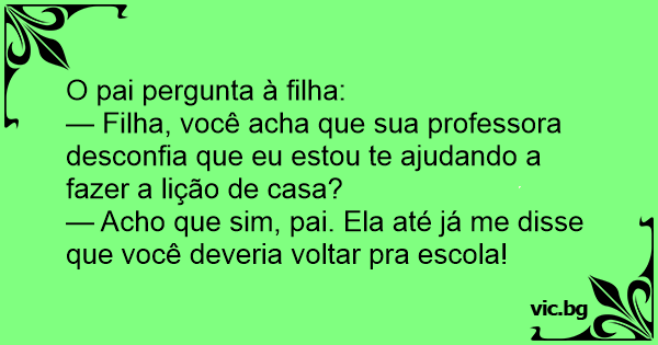 — Filha, você acha que sua professora desconfia que eu estou te ajudando a fazer a lição de casa?
