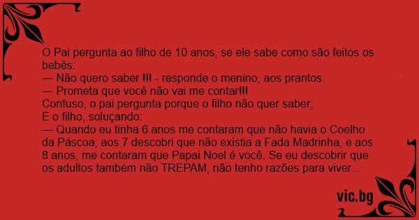 — Quando eu tinha 6 anos me contaram que não havia o Coelho da Páscoa; aos 7 descobri que não existia a Fada Madrinha, e aos 8 anos, me contaram que Papai Noel é você. Se eu descobrir que os adultos também não TREPAM, não tenho razões para viver !!!!!
