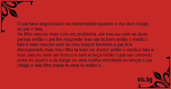Se filho nasceu mas com um problema, ele nasceu sem as duas pernas então o pai lhe responde mas ele ta bem então o medico fala é mas nasceu sem os dois braços tambem o pai fiса desesperado mas meu filho ta bem ne doutor então o medico fala e mas nasceu sem um tronco e sem a beça então o pai sai correndo entra no quarto e de longe ve uma orelha enrrolada no lençol o pai chega e fala filho papai te ama ta então o medico chega pro pai e fala da pro sr fala um pouco mais alto que ele é meio surdo