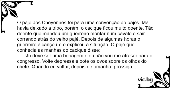 O pajé dos Cheyennes foi para uma convenção de pajés. Mal havia deixado a tribo, porém, o cacique ficou muito doente. Tão doente que mandou um guerreiro montar num cavalo e sair correndo atrás do velho pajé. Depois de algumas horas o guerreiro alcançou-o e explicou a situação. O pajé que conhecia as manhas do cacique disse: