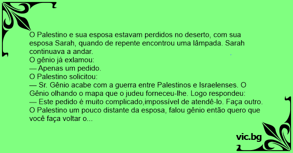 — Sr. Gênio acabe com a guerra entre Palestinos e Israelenses. O Gênio olhando o mapa que o judeu forneceu-lhe. Logo respondeu: