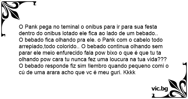 O bebado fiса olhando pra ele. o Pank com o cabelo todo arrepiado,todo colorido.. O bebado continua olhando sem parar ele meio enfurecido fala pow bixo o que é que tu ta olhando pow cara tu nunca fez uma loucura na tua vida???