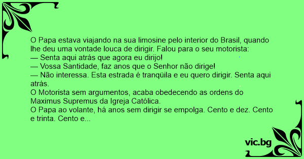 O Papa estava viajando na sua limosine pelo interior do Brasil, quando lhe deu uma vontade louca de dirigir. Falou para o seu motorista: