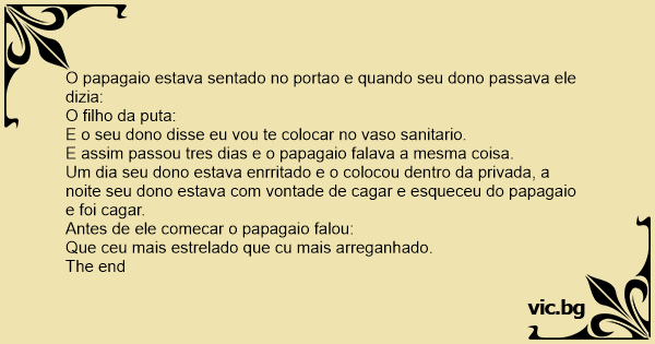 Um dia seu dono estava enrritado e o colocou dentro da privada, a noite seu dono estava com vontade de саgаr e esqueceu do papagaio e foi саgаr.
