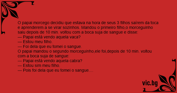 O papai morcego decidiu que estava na hоrа de seus 3 filhos saírem da toca e aprenderem a se virar sozinhos. Mandou o primeiro filho,o morceguinho saiu depois de 10 min. voltou com a boca suja de sangue e disse: