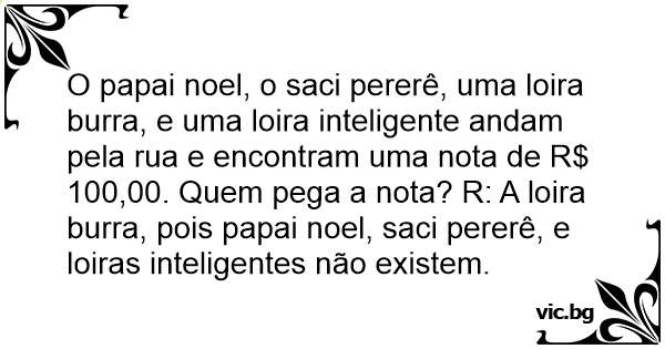 O papai noel, o saci pererê, uma loira burra, e uma loira inteligente andam pela rua e encontram uma nota de R$ 100,00. Quem pega a nota? R: A loira burra, pois papai noel, saci pererê, e loiras inteligentes não existem.