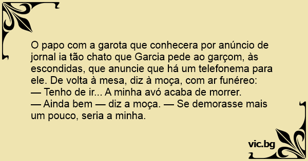 O papo com a garota que conhecera por anúncio de jornal ia tão chato que Garcia pede ao garçom, às escondidas, que anuncie que há um telefonema para ele. De volta à mesa, diz à moça, com ar funéreo: