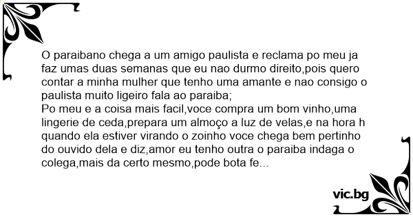 O paraibano chega a um amigo paulista e reclama po meu ja faz umas duas semanas que eu nao durmo direito,pois quero contar a minha mulher que tenho uma amante e nao consigo o paulista muito ligeiro fala ao paraiba;