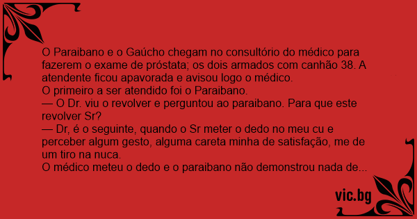O Paraibano e o Gaúcho chegam no consultório do médico para fazerem o exame de próstata; os dois armados com canhão 38. A atendente ficou apavorada e avisou logo o médico.