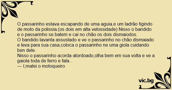O passarinho estava escapando de uma aguia,e um ladrão figindo de moto da polissia.(os dois em alta velossidade) Nisso o bandido e o passarinho se batem e cai no chão os dois dismaiodos.