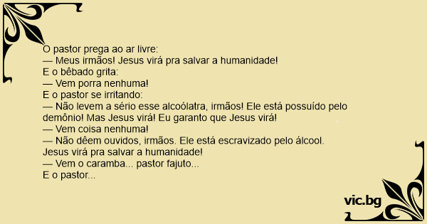 — Não levem a sério esse alcoólatra, irmãos! Ele está possuído pelo demônio! Mas Jesus virá! Eu garanto que Jesus virá!