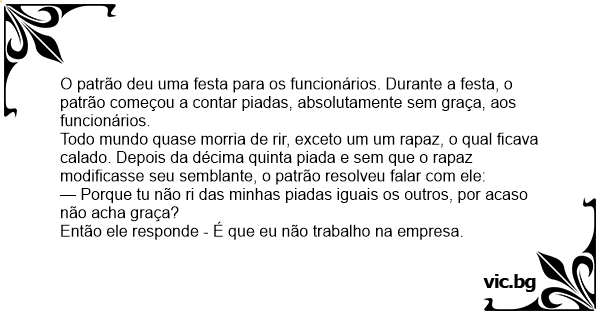 Todo mundo quase morria de rir, exceto um um rapaz, o qual ficava calado. Depois da décima quinta piada e sem que o rapaz modificasse seu semblante, o patrão resolveu falar com ele: