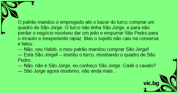 O patrão mandou o empregado até o bazar do turco comprar um quadro de São Jorge. O turco não tinha São Jorge, e para não perder o negócio resolveu dar um jeito e empurrar São Pedro para o incauto e inexperiente rapaz. Mas o sujeito não caiu na conversa e falou: