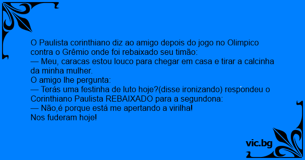 O Paulista corinthiano diz ao amigo depois do jogo no Olimpico contra o Grêmio onde foi rebaixado seu timão: