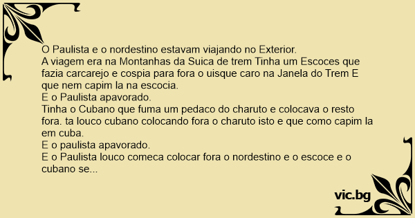 E o Paulista louco comeca colocar fora o nordestino e o escoce e o cubano se dizem que o Paulista esta louco, e mas la em Sao Paulo Nordestino e como capim.