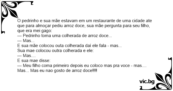 O pedrinho e sua mãe estavam em um restaurante de uma cidade ate que para almoçar pediu arroz doce, sua mãe pergunta para seu filho, que era mei gago: