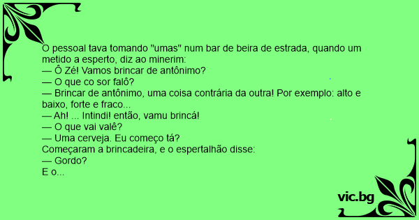— Brincar de antônimo, uma coisa contrária da outra! Por exemplo: alto e baixo, forte e fraco...