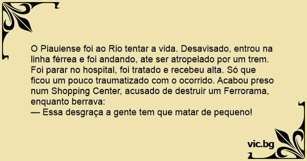 O Piauiense foi ao Rio tentar a vida. Desavisado, entrou na linha férrea e foi andando, ate ser atropelado por um trem. Foi parar no hospital, foi tratado e recebeu alta. Só que ficou um pouco traumatizado com o ocorrido. Acabou preso num Shopping Center, acusado de destruir um Ferrorama, enquanto berrava: