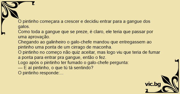 Chegando ao galinheiro o galo-chefe mandou que entregassem ao pintinho uma ponta de um cirrago de maconha.