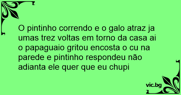 O pintinho correndo e o galo atraz ja umas trez voltas em torno da casa ai o papaguaio gritou encosta o cu na parede e pintinho respondeu não adianta ele quer que eu chupi