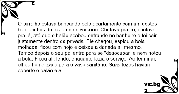 Tempo depois o seu pai entra para se "desocupar" e nem notou a bola. Ficou ali, lendo, enquanto fazia o serviço. Ao terminar, olhou horrorizado para o vaso sanitário. Suas fezes haviam coberto o balão e a impressão que se tinha era de um imenso, um absurdo, um gigantesco bolo fесаl! Sem acreditar naquilo, ligou dali mesmo, pelo celular, para o seu amigo que era médico: