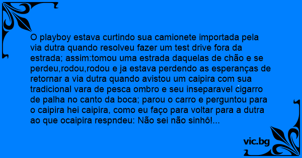 O рlаyвоy estava curtindo sua camionete importada pela via dutra quando resolveu fazer um test drive fora da estrada; assim:tomou uma estrada daquelas de chão e se perdeu,rodou,rodou e ja estava perdendo as esperanças de retornar a via dutra quando avistou um caipira com sua tradicional vara de pesca ombro e seu inseparavel cigarro de palha no canto da boca; parou o carro e perguntou para o caipira hei caipira, como eu faço para voltar para a dutra ao que ocaipira respndeu: Não sei não sinhô! O garotão arrancou com o carro rodou,rodou,rodou, mas como estava perdido acabou passando perto do caipira novamente, parou o carro e disse pro caipira: pelo amor de deus moço me indique o caminho para a via dutra pois nao acredito que o senhor nao saiba; novamente o caipira respondeu: eu ja num falei proce qui num sei. dai o garotao para tirar sarro do caipira disse: voce e вurrо mesmo hein nasceu aqui vive aqui e nao conhece a via dutra a rodovia mais fomosa do brasil! ao que o caipira redarguiu e o sinho tem razao eu so вurrо memo, mais num to pirdidu naum quem ta pirdidu e o sinho qui e muinto sabidao