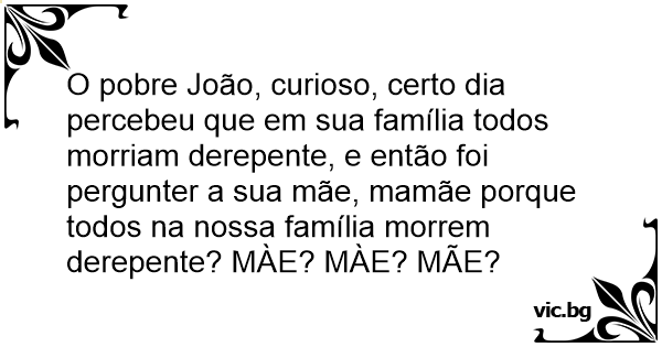 O pobre João, curioso, certo dia percebeu que em sua família todos morriam derepente, e então foi pergunter a sua mãe, mamãe porque todos na nossa família morrem derepente? MÀE? MÀE? MÃE?